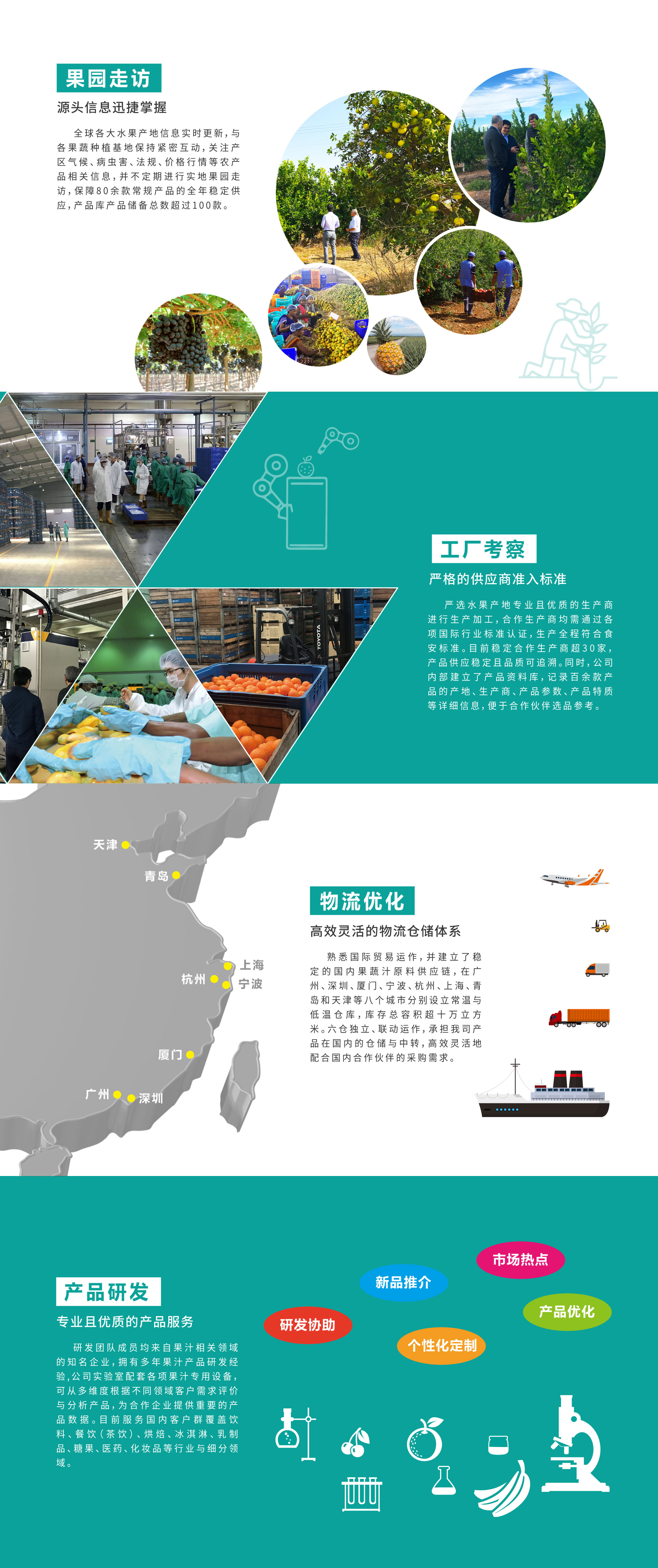 我们熟悉国际贸易操作流程,了解全球的水果产区与资源分布以及各类生产工艺,并与全球各地的优秀果蔬种植农场、果汁果浆生产商保持着稳定而深入的合作关系。对于供应商的选择我们始终坚持严格的准入标准,所有生产商均需通过HACCP、FSSC、SGF、KOSHER及HALAL等国际行业标准认证,确保所供应产品安全稳定、绿色健康。